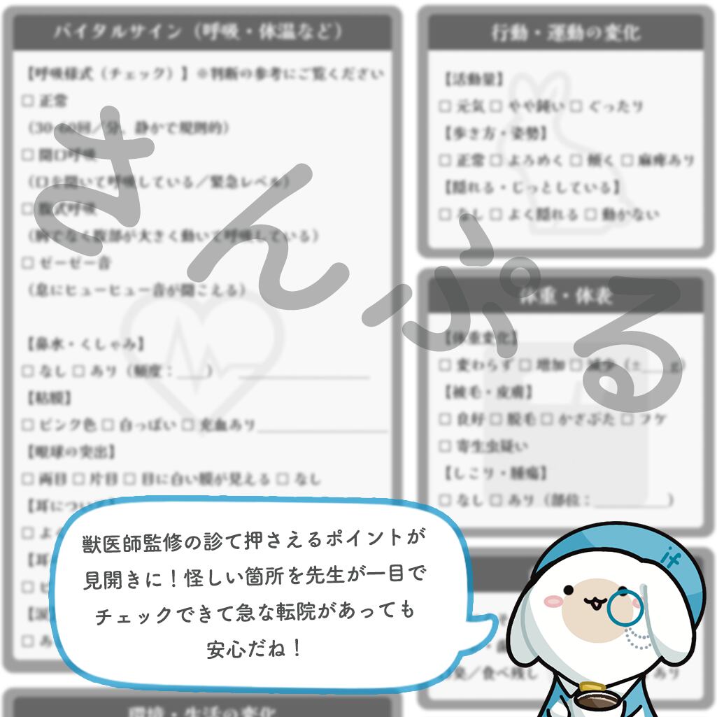 また、【記入済み】の箇所は病院側でコピーをとっても大丈夫なので、忙しい獣医師の聞き洩らしや飼い主の伝え忘れを防止できます。